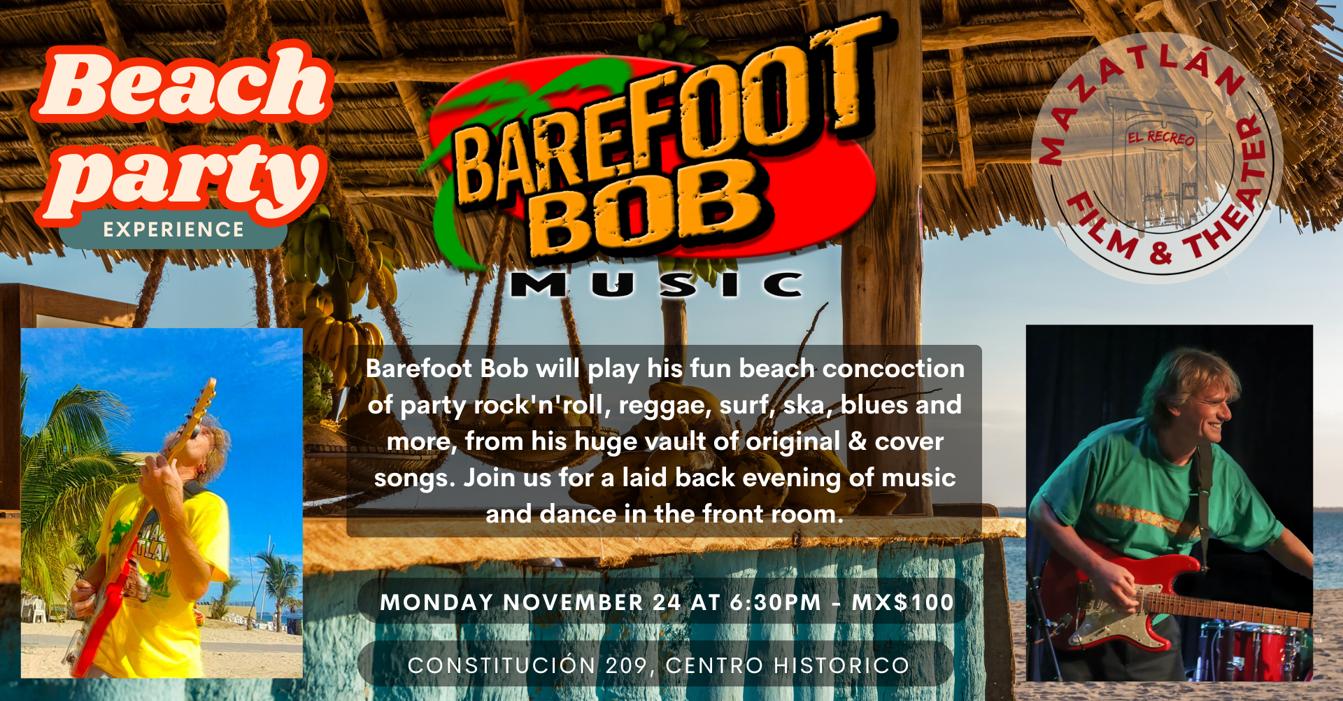 Barefoot Bob will play his fun beach concoction of party rock’n’roll, reggae, surf, ska, blues and more, from his huge vault of original & cover songs. Join us for a laid back evening of music and dance in the front room.